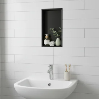 Modern recessed wall niche made from stainless steel with a sleek matte finish — available in matte black, gold, and silver.
