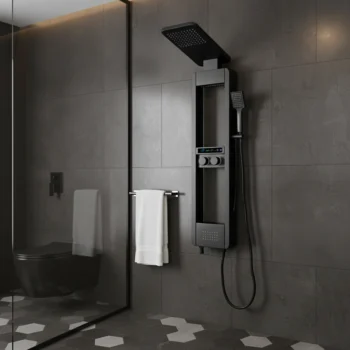 Luxury stainless steel shower panel with rainfall, waterfall, body jets, hand shower, and LED digital water monitor — available in black and silver.