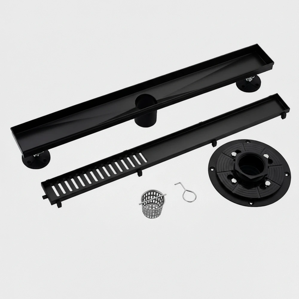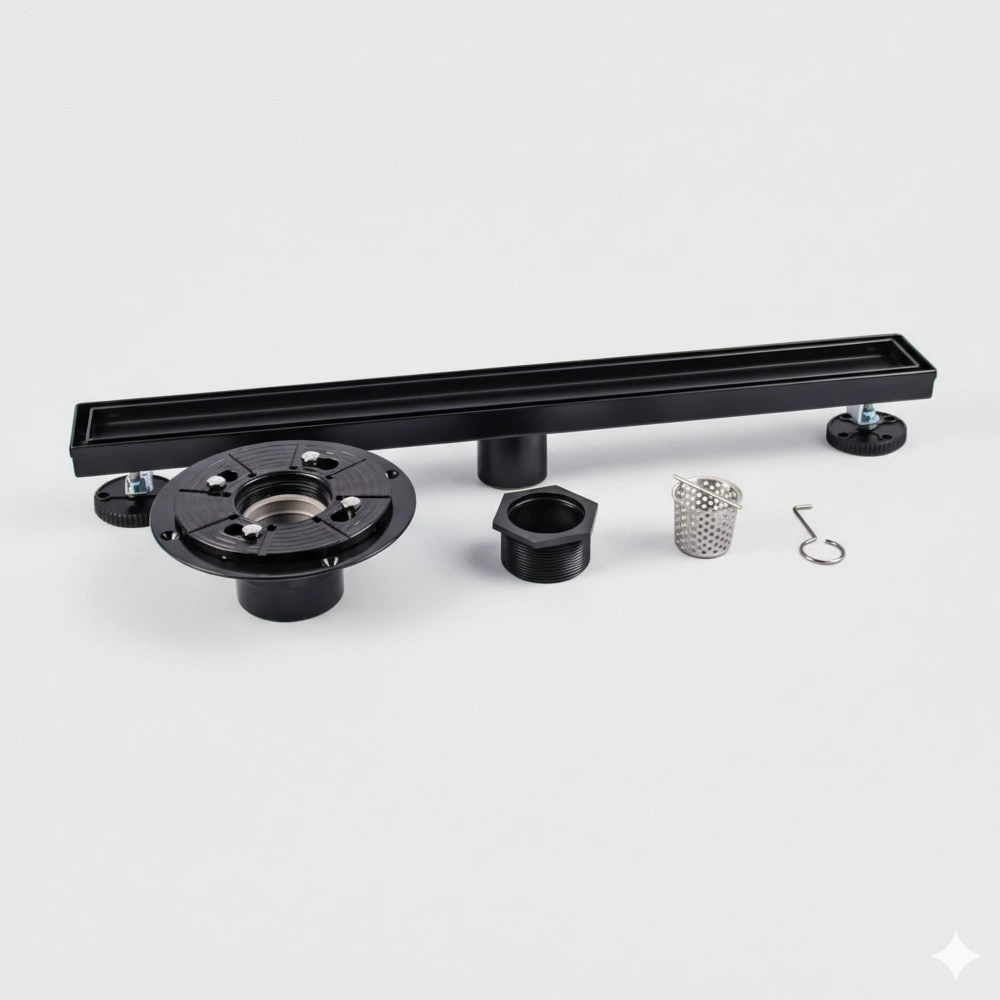 Luxury 6β x 6β linear drainage system with a sleek modern design, efficient water flow, and rust-resistant construction β available in black, gold, and silver.