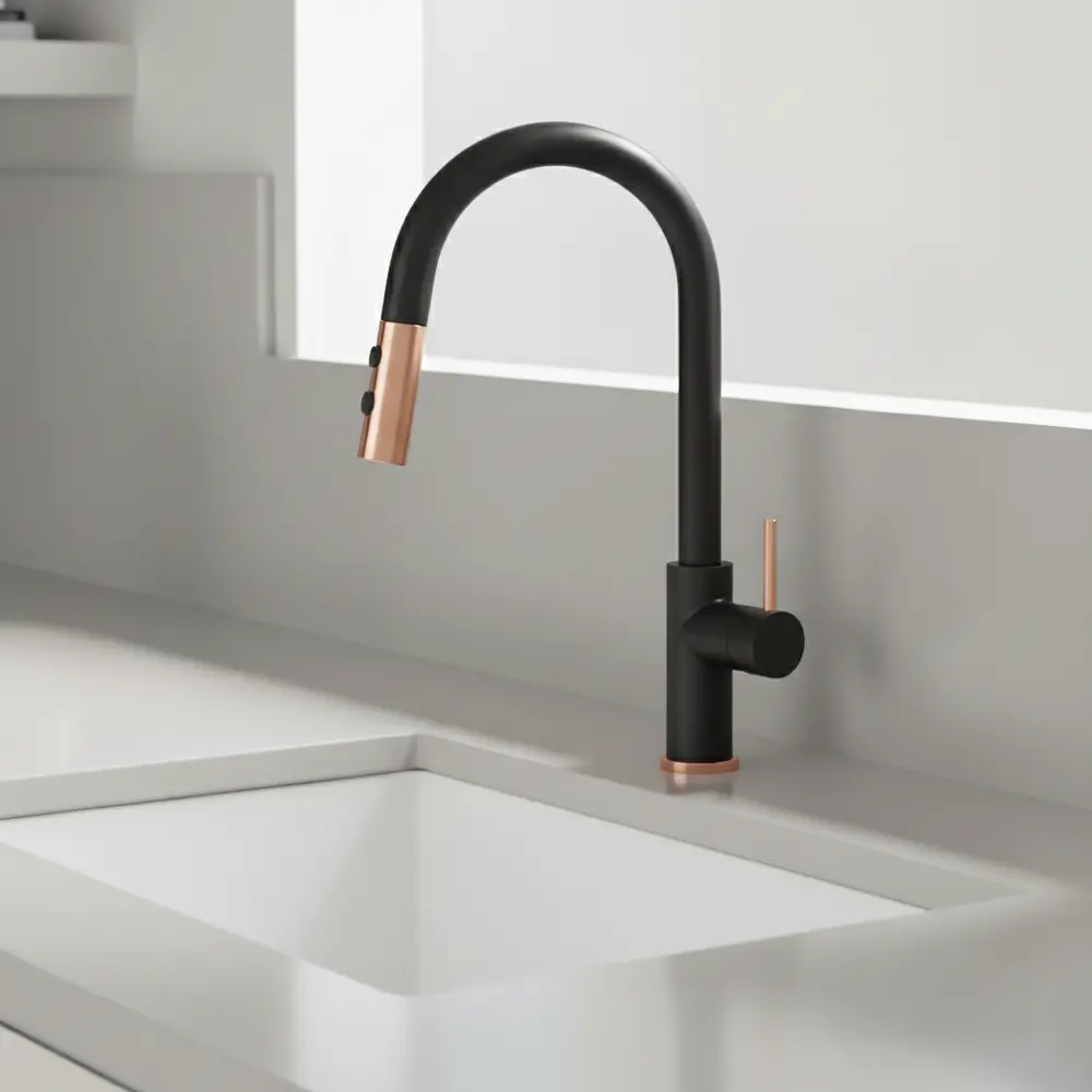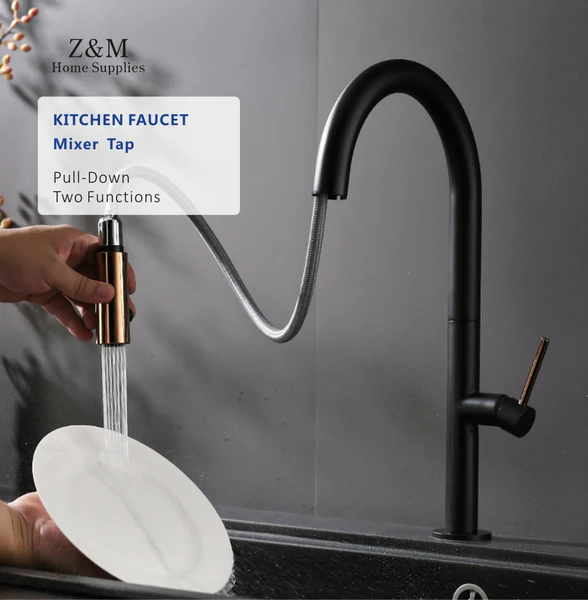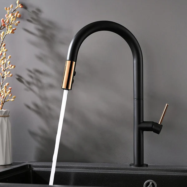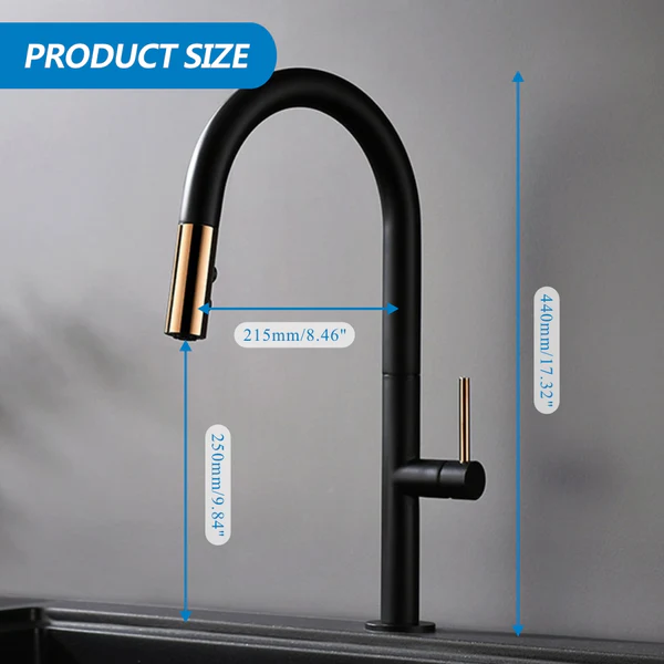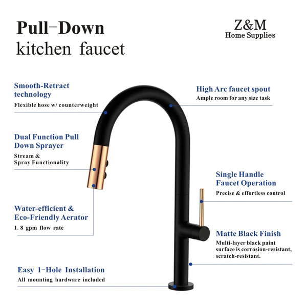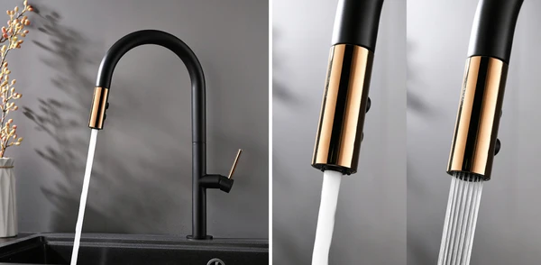 Upgrade your kitchen with this modern pull-down faucet featuring a sleek matte black and gold finish. Designed for both elegance and functionality, it combines smooth retract technology with dual spray modes for convenience and efficiency.
