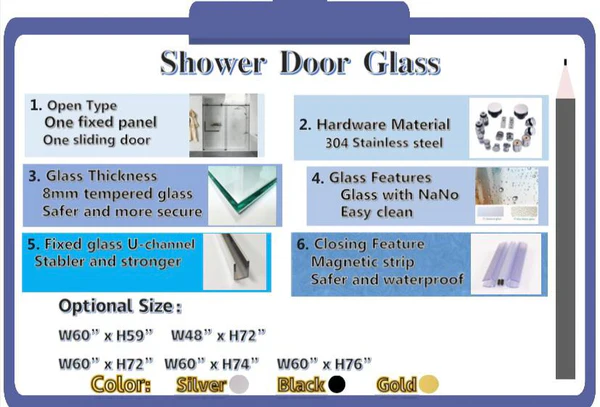 Available in Silver, Black, and Gold finishes, this shower door combines modern elegance with everyday functionality, making it an ideal choice for most bathtub spaces.